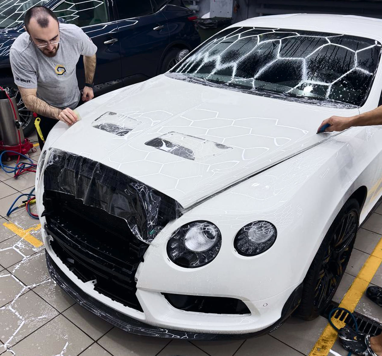 Полная оклейка кузова защитной полиуретановой плёнкой — это надёжный способ сохранить идеальное состояние лакокрасочного покрытия. В студии «Мед Детейл» мы аккуратно оклеиваем все уязвимые элементы автомобиля, защищая их от сколов, царапин, реагентов и дорожного пескоструя.