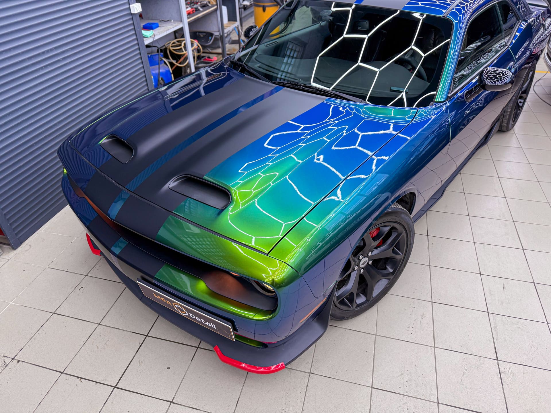 В нашу студию приехал уникальный Dodge Challenger. Изначально — «скучный» белый с типично американским набором: чёрная крыша, матовый капот и немного винила сзади. Задача от клиента — радикально преобразить внешний вид и освежить салон, при этом устранить дефекты кузова. В итоге получили яркий, спортивный проект, который дарит эмоции с первого взгляда.