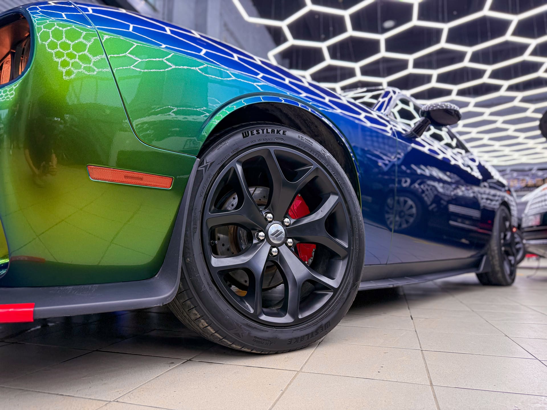 - Кузов — цветной глянцевый полиуретан PPF «хамелеон». Плёнка меняет оттенок под углом, подчёркивает мышцы кузова, при этом защищает от сколов и пескоструя.
