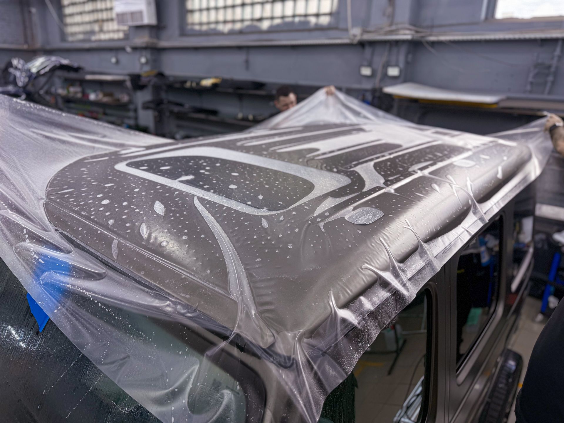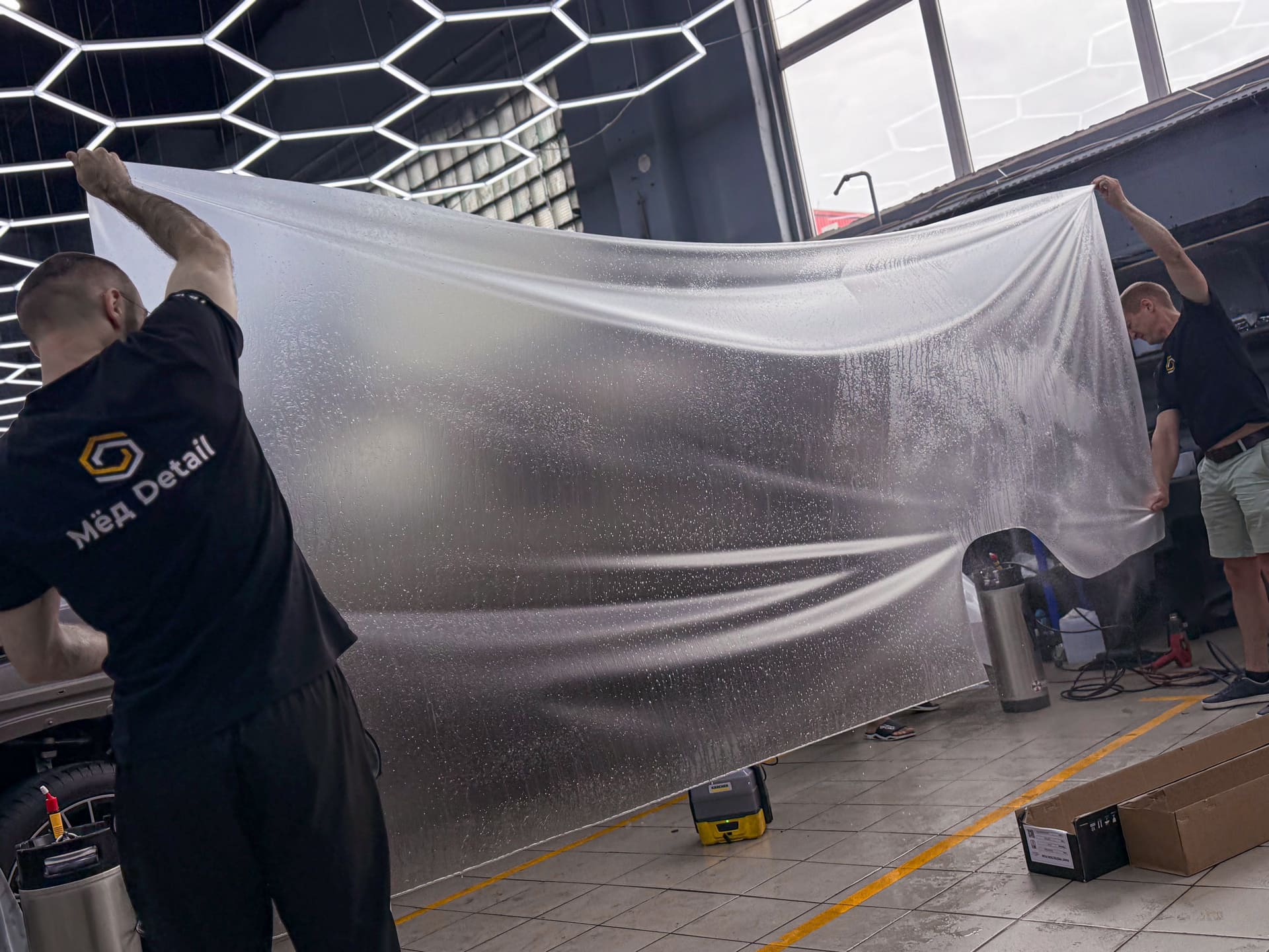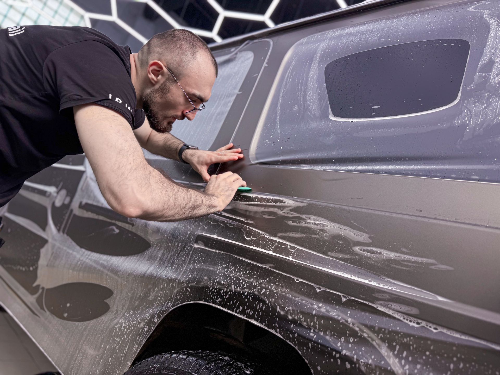 Для сложных зон использовали пленку шириной до 1,8 м — например, крыша оклеена из одного листа, а не из двух, как это часто делается ради экономии.Защита стекол и оптики