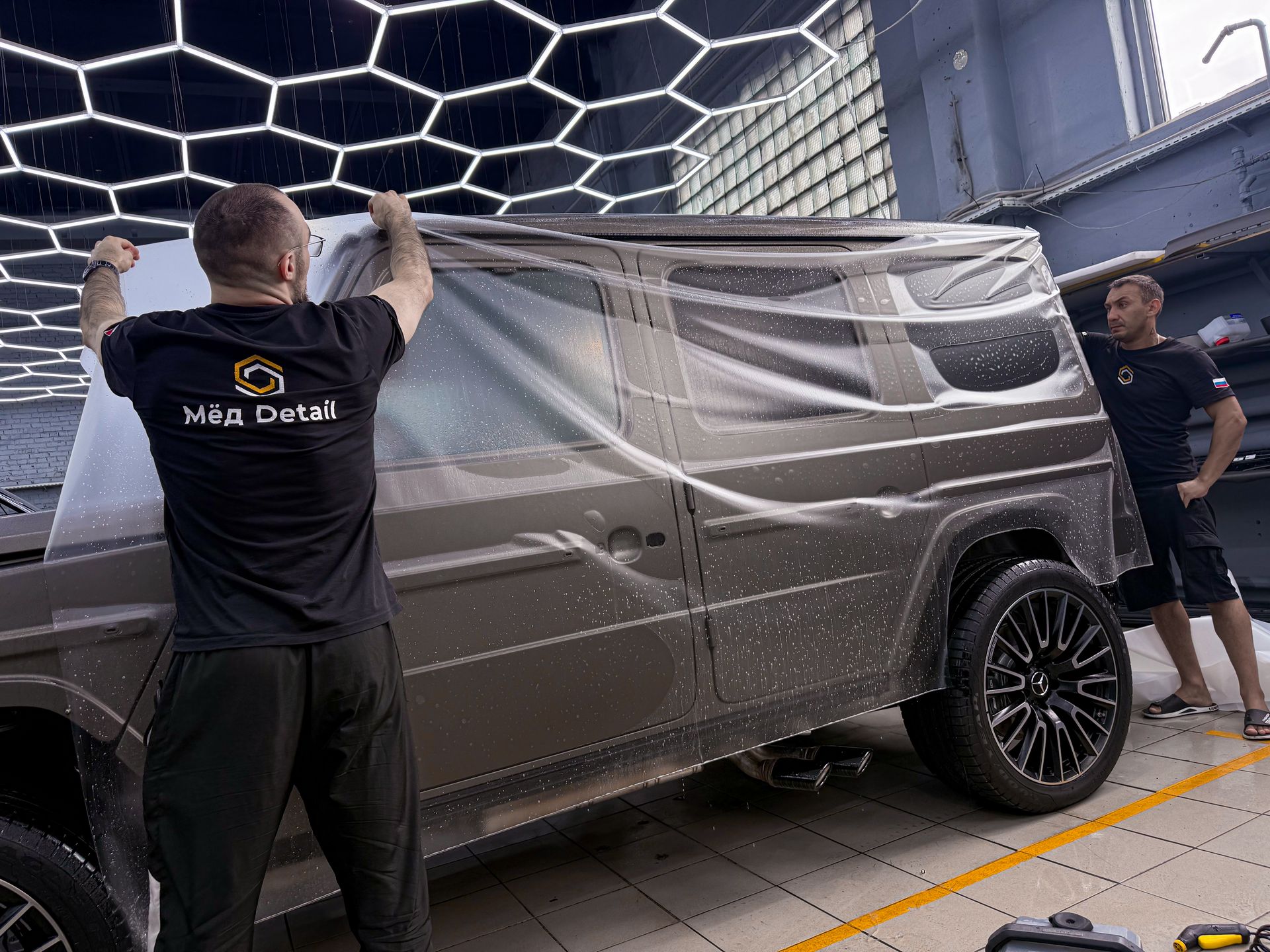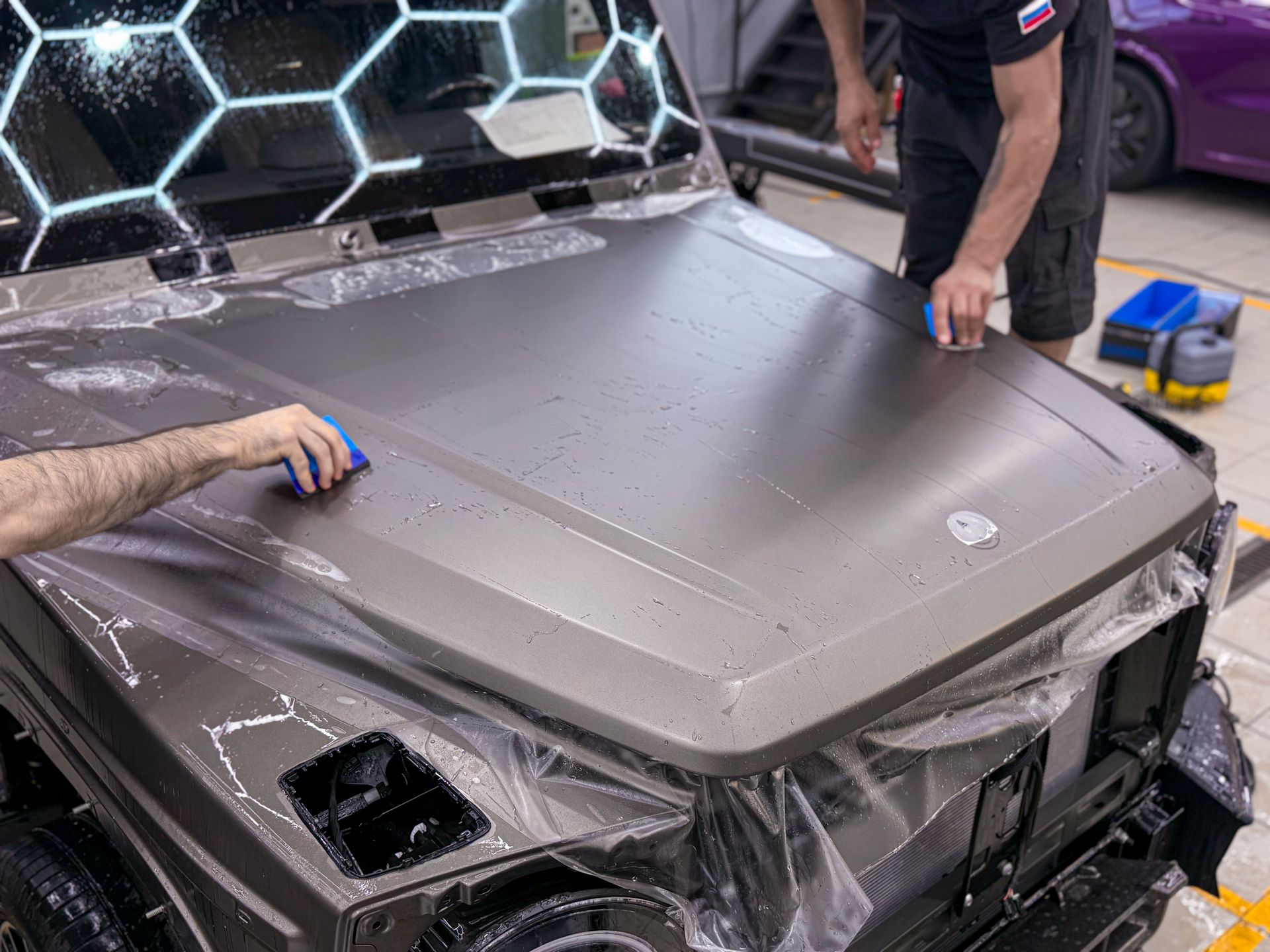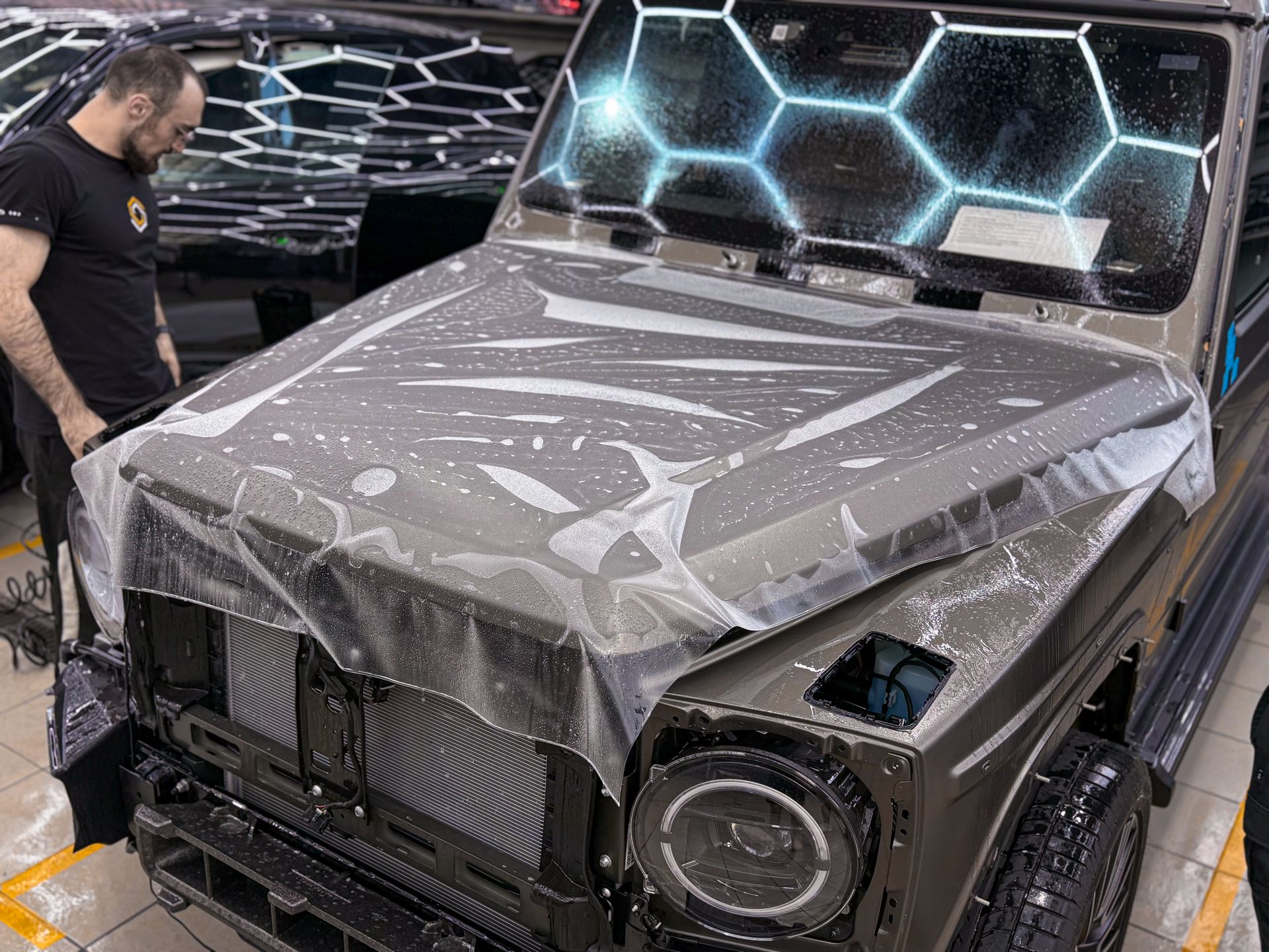 Провели арматурные работы, чтобы спрятать кромки и выполнить подвороты везде, где это конструктивно возможно. Итог — максимально «заводской» вид.Почему это критично для матового Гелендвагена