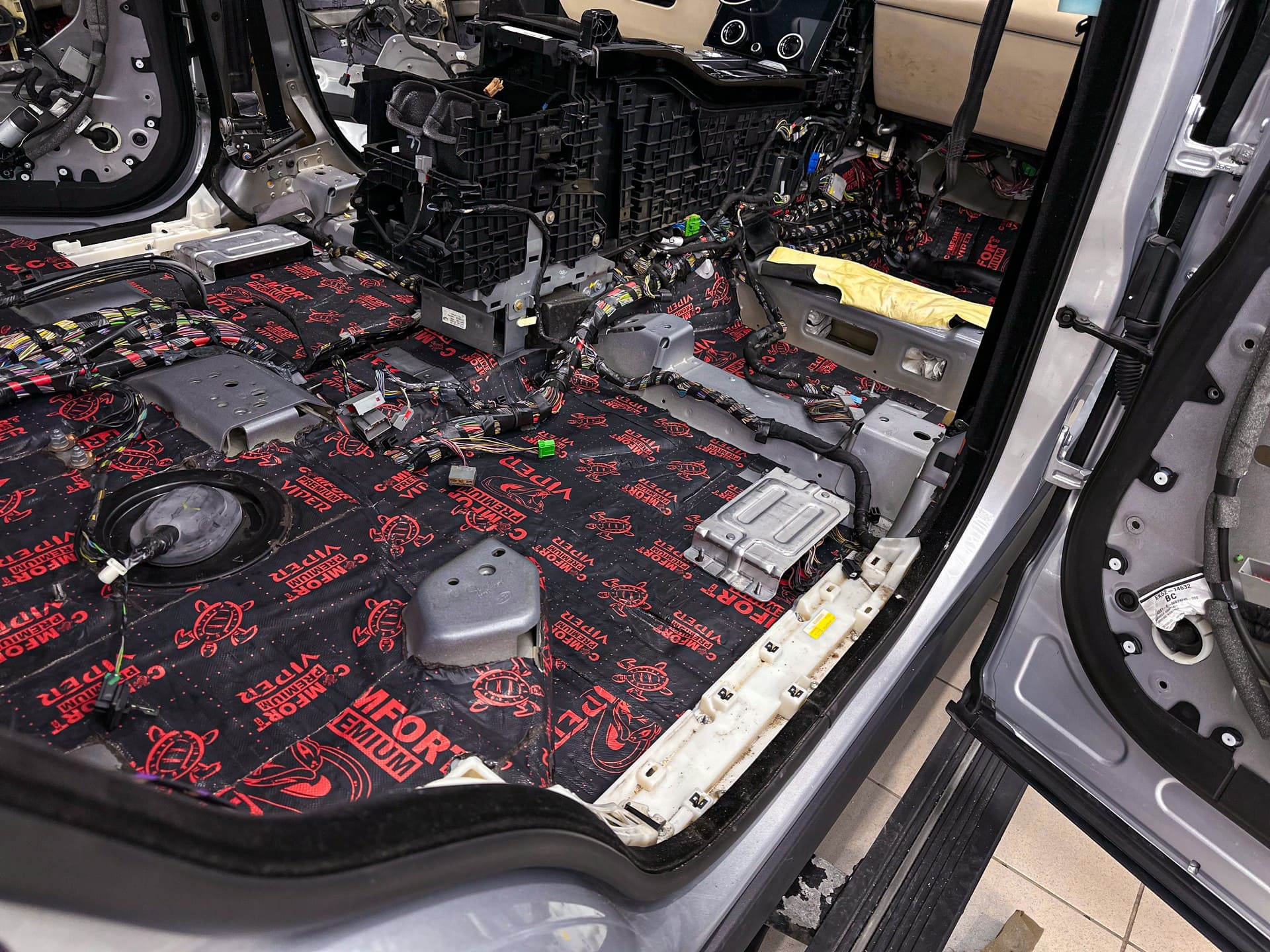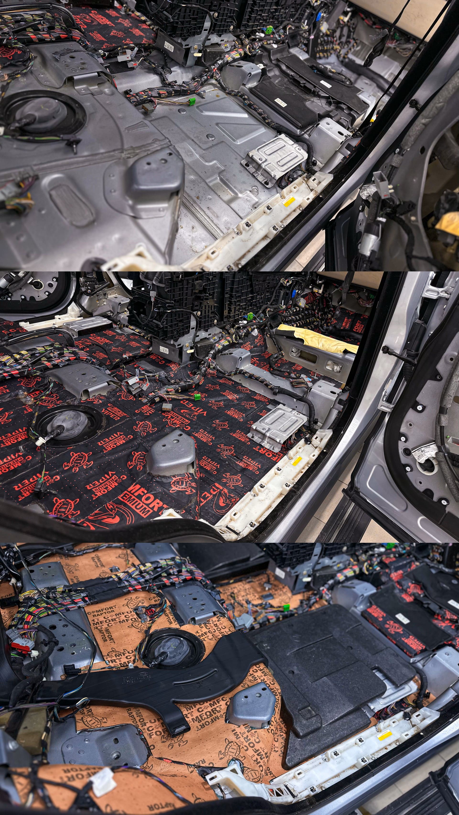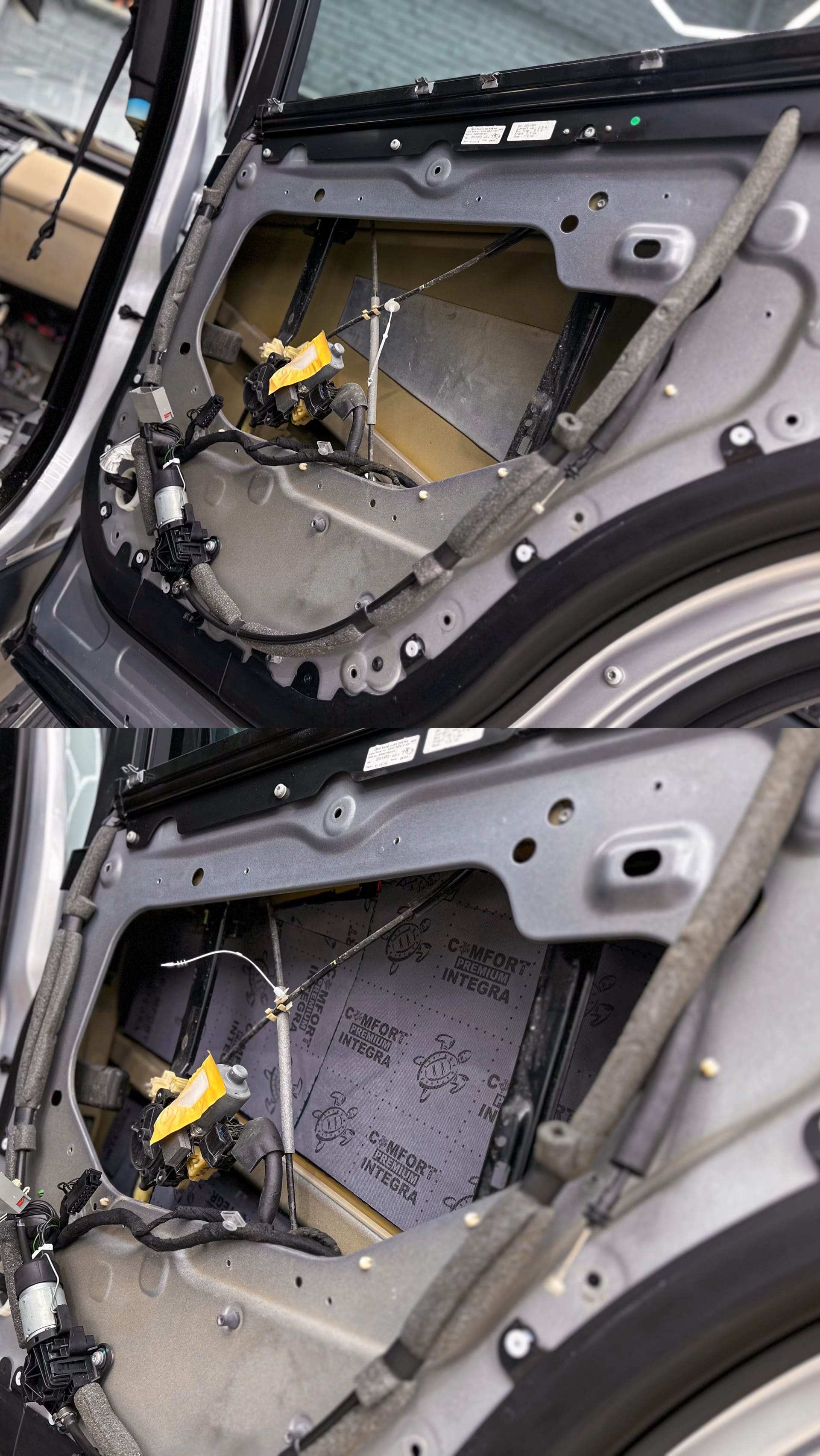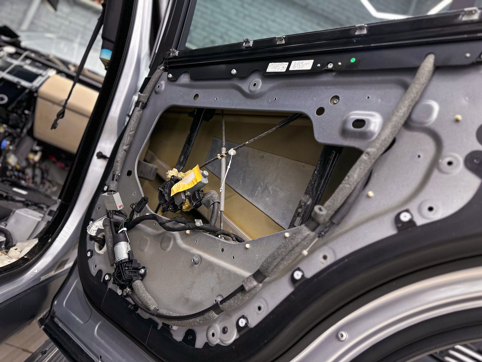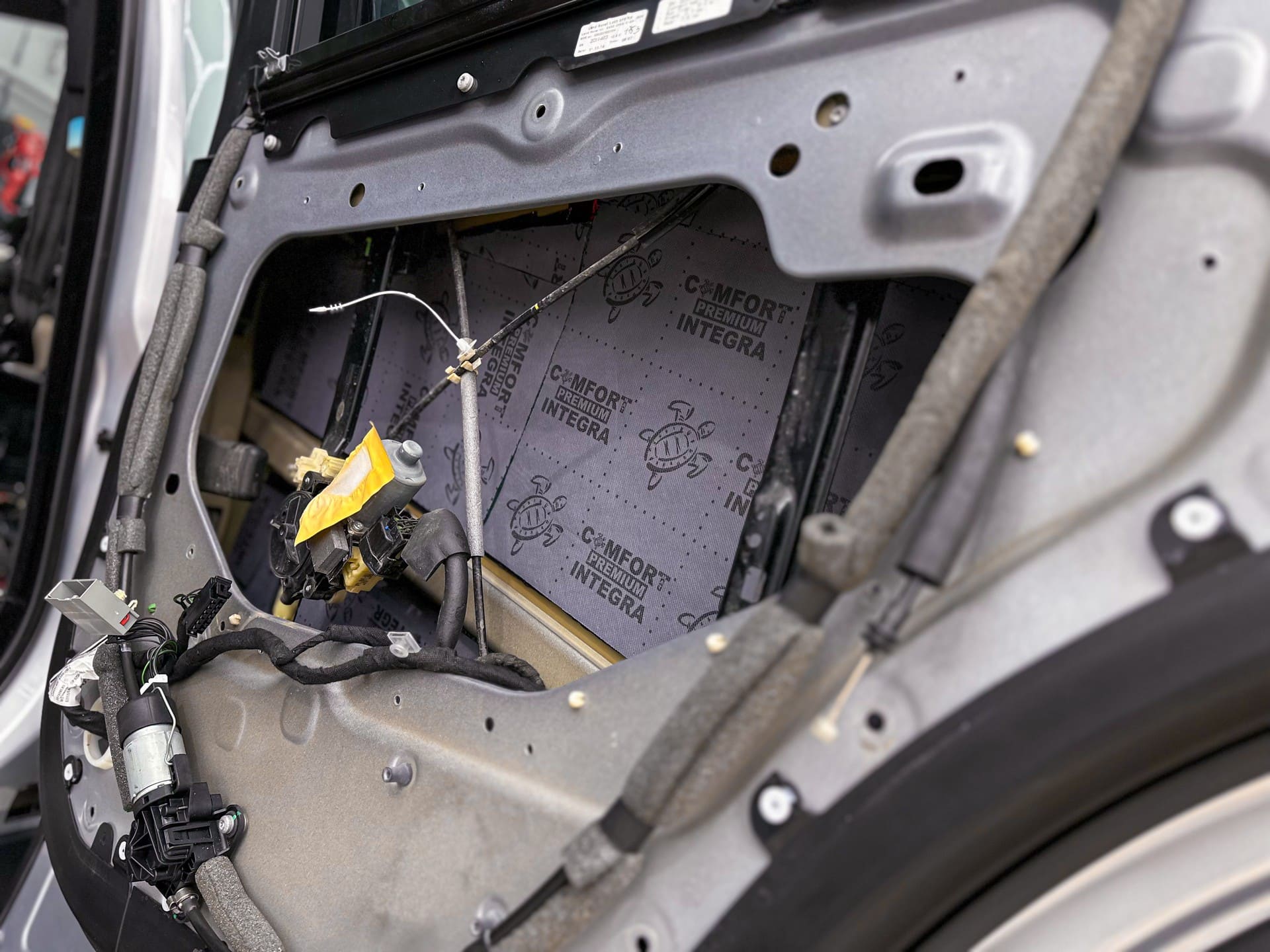 Двери были сложной частью из-за проводов и электроники. Мы сняли обшивку дверей и наклеили тонкие шумоизоляционные листы на внутреннюю часть двери. Это снизило шум от ветра и вибрации. При этом старались не трогать провода и не сломать клипсы.