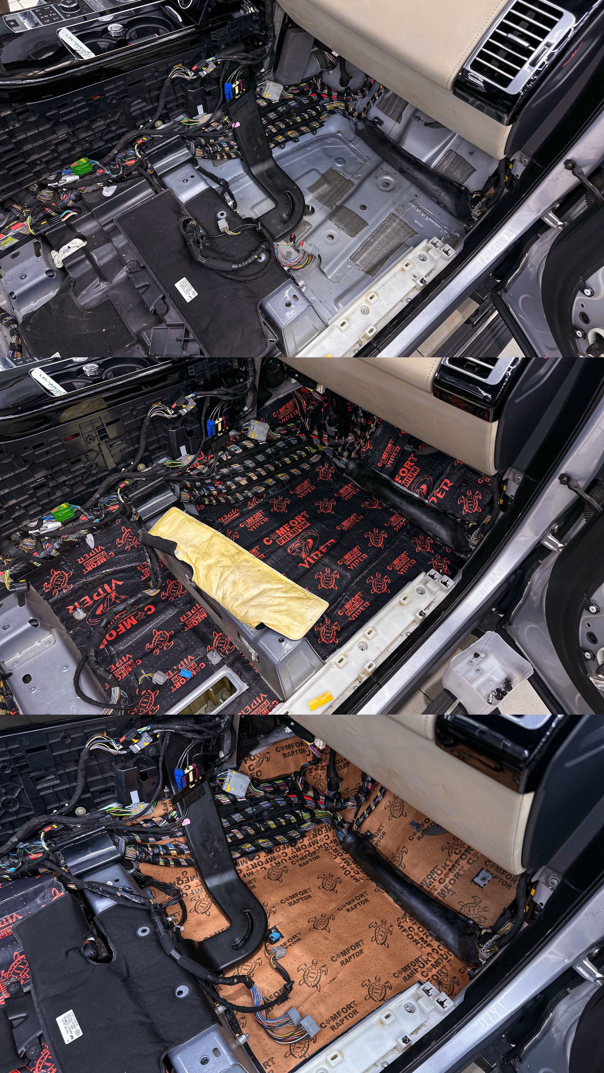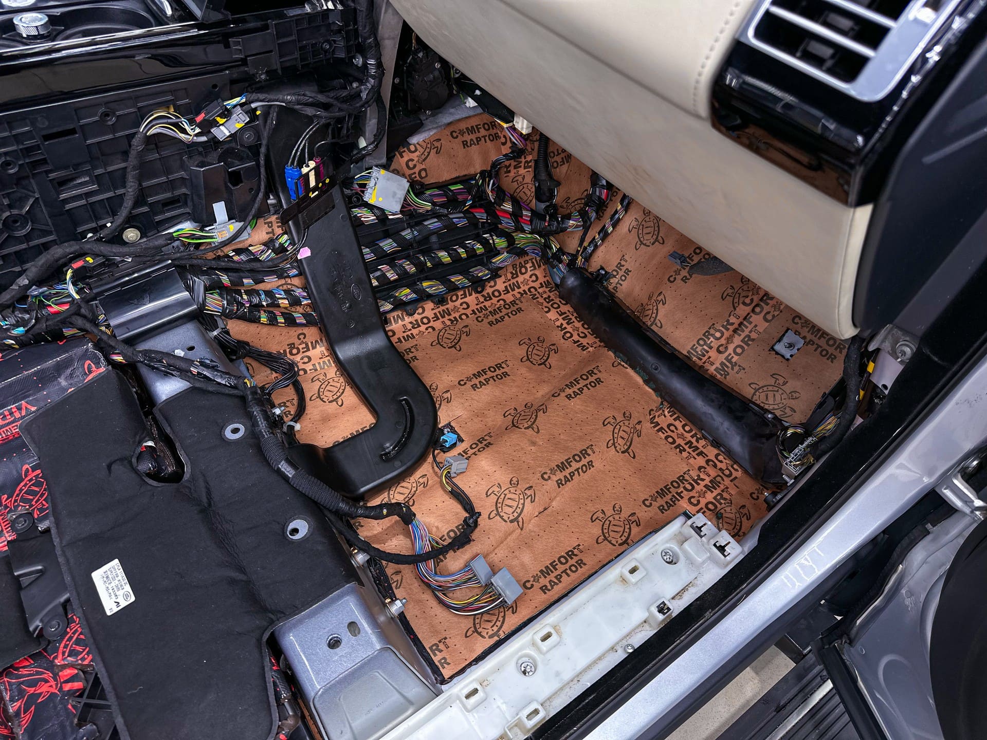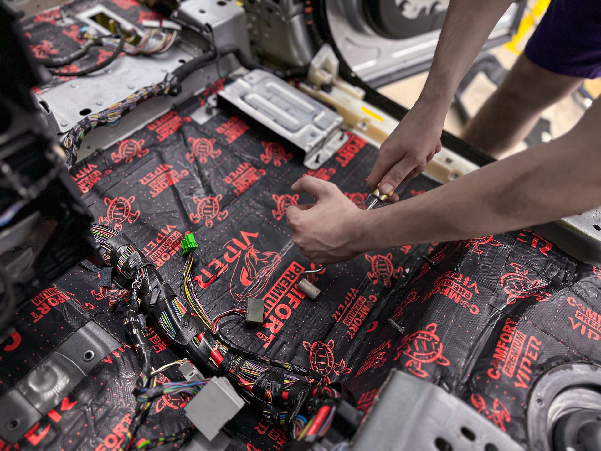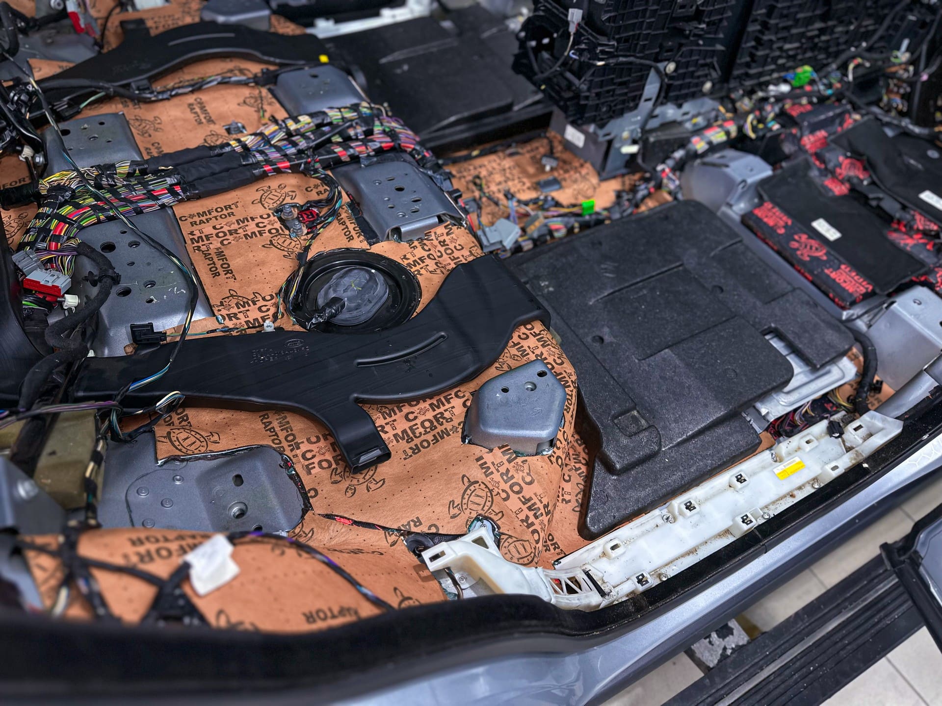 Двери были сложной частью из-за проводов и электроники. Мы сняли обшивку дверей и наклеили тонкие шумоизоляционные листы на внутреннюю часть двери. Это снизило шум от ветра и вибрации. При этом старались не трогать провода и не сломать клипсы.