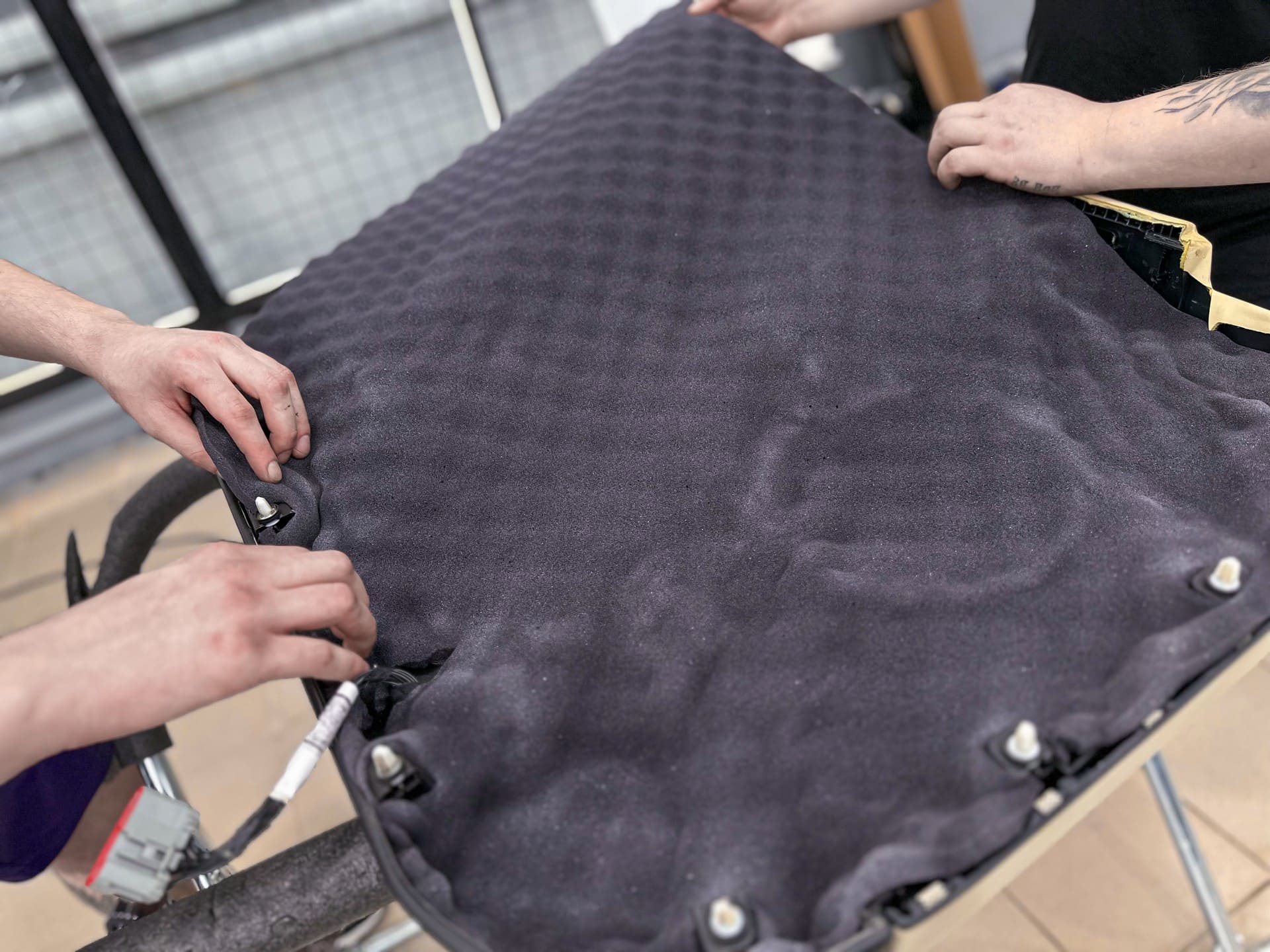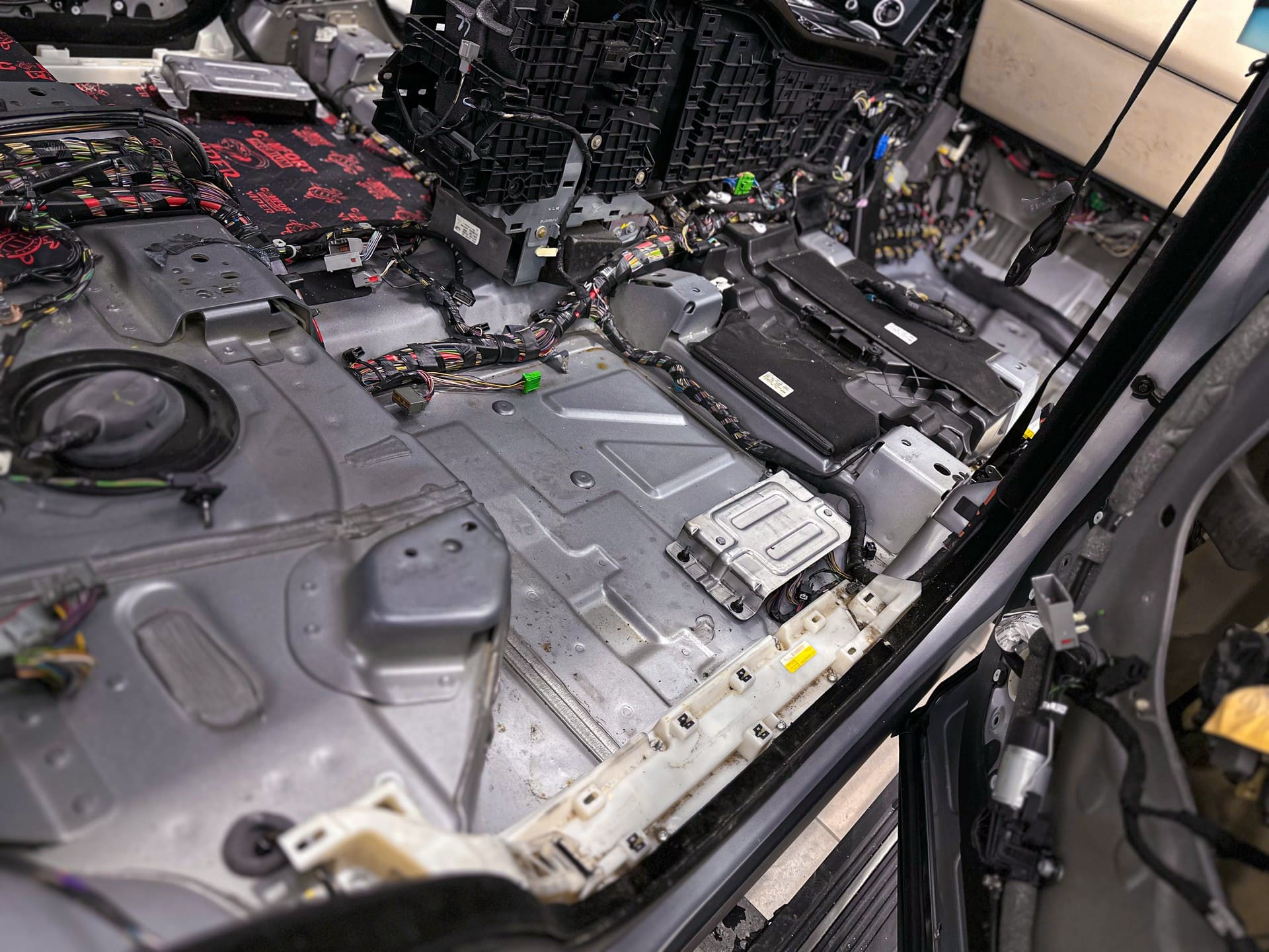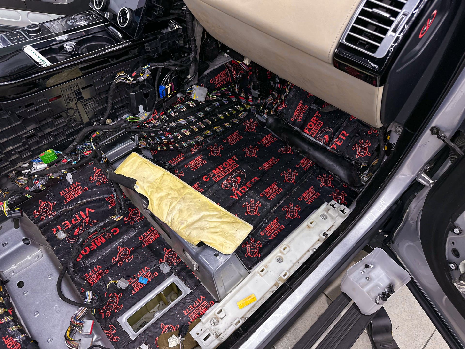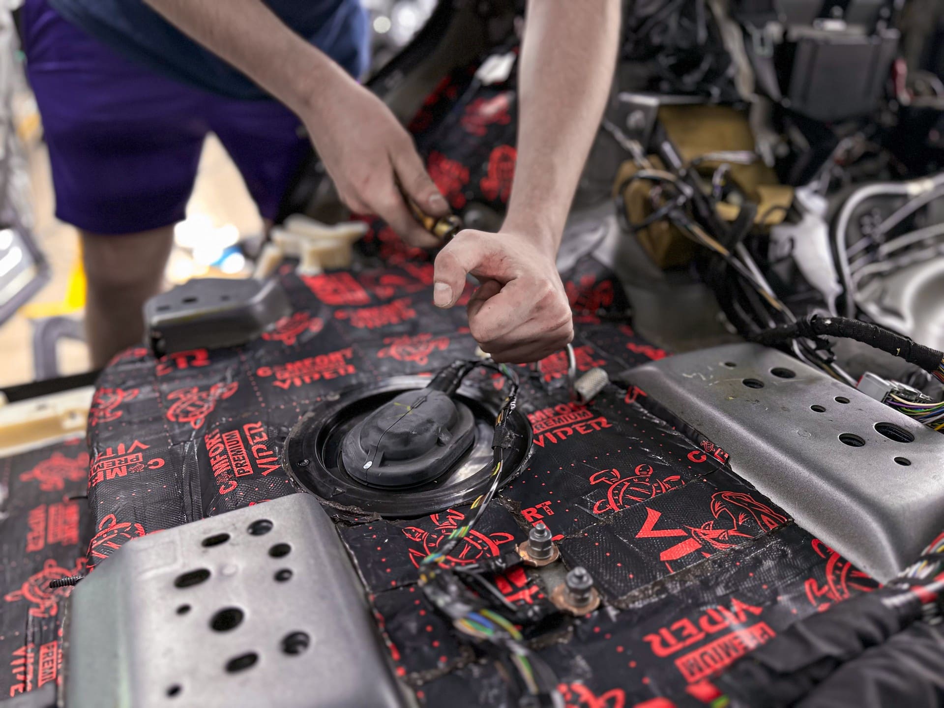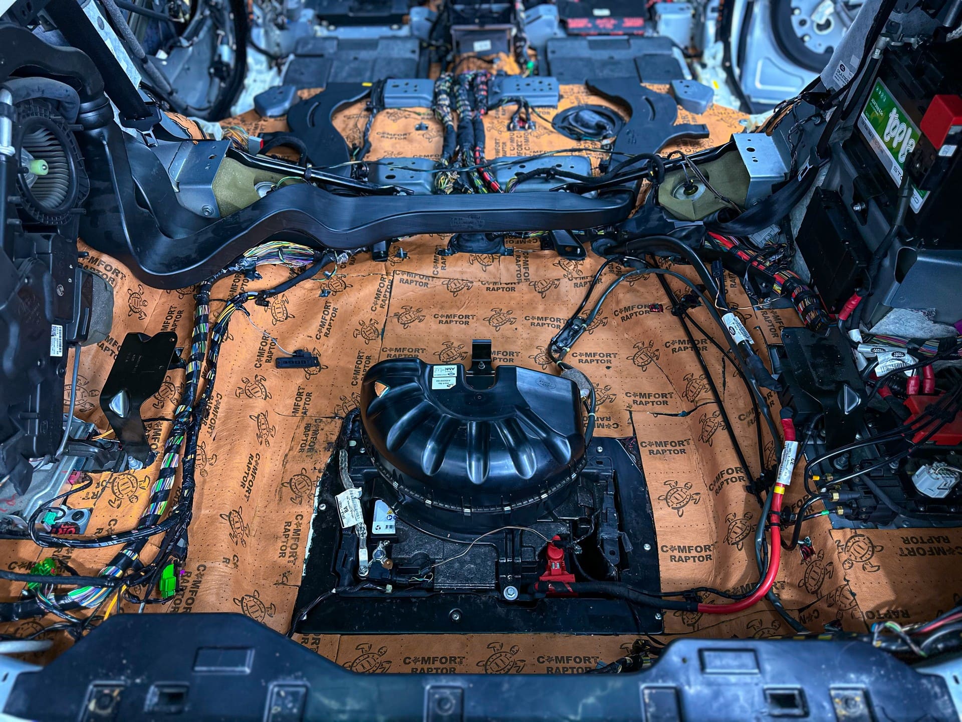 Двери были сложной частью из-за проводов и электроники. Мы сняли обшивку дверей и наклеили тонкие шумоизоляционные листы на внутреннюю часть двери. Это снизило шум от ветра и вибрации. При этом старались не трогать провода и не сломать клипсы.