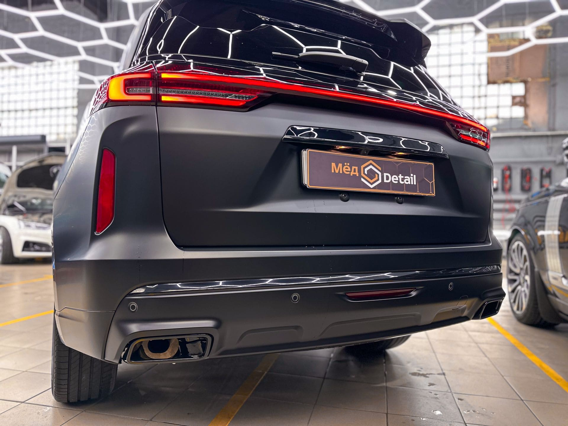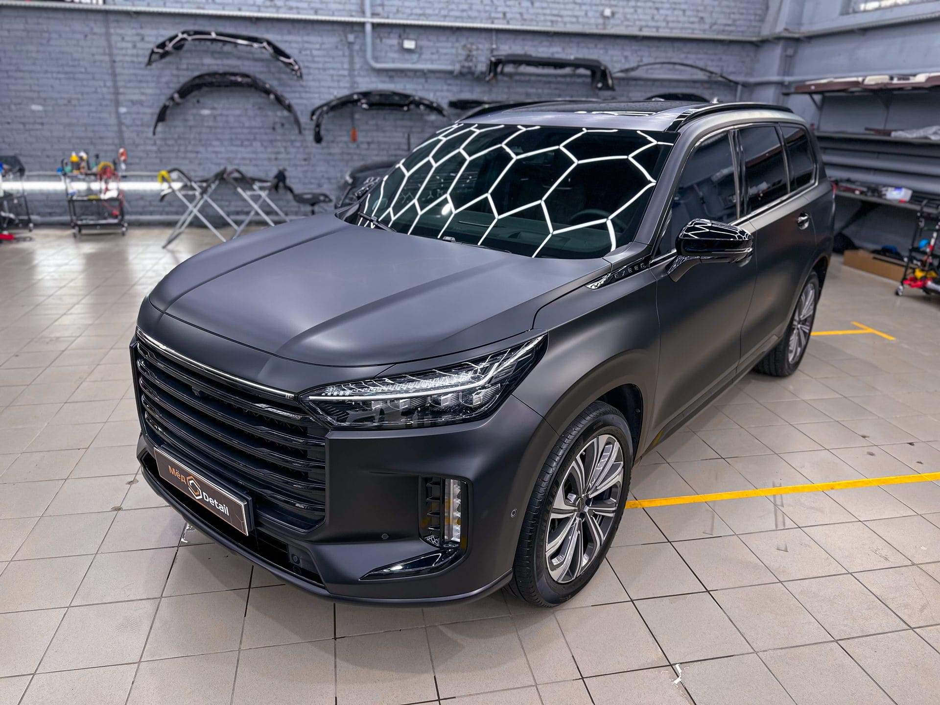 В студию Мёд Detail заехал Exeed VX с проблемной дилерской оклейкой. На передних зонах риска лакокрасочное покрытие было порезано, местами плёнка отходила. Клиент решил полностью переклеить автомобиль, придать кузову матовый финиш и заменить весь хром на чёрный глянец. Задача получилась объёмной: помимо рестайлинга — убрать последствия некачественной прошлой работы.