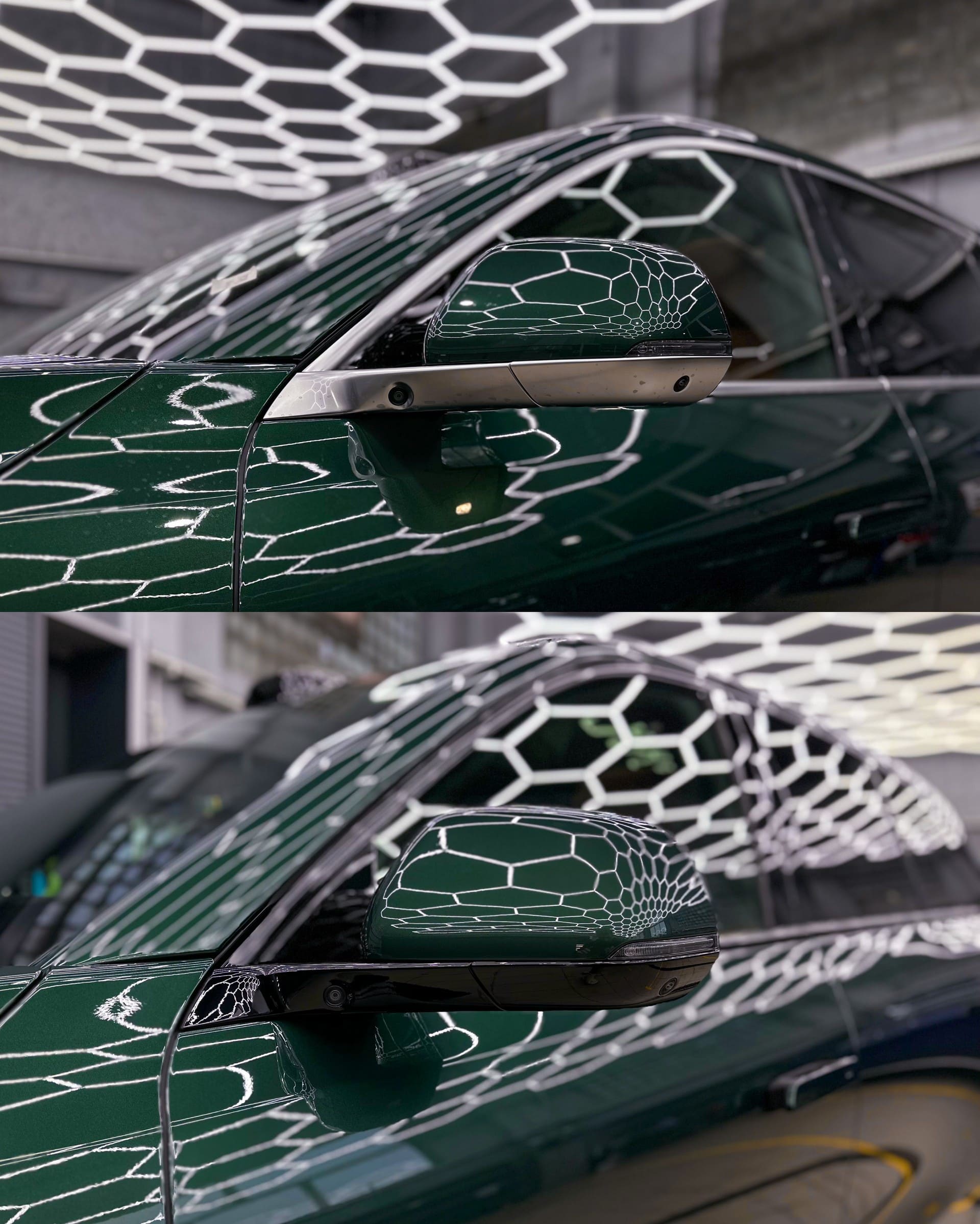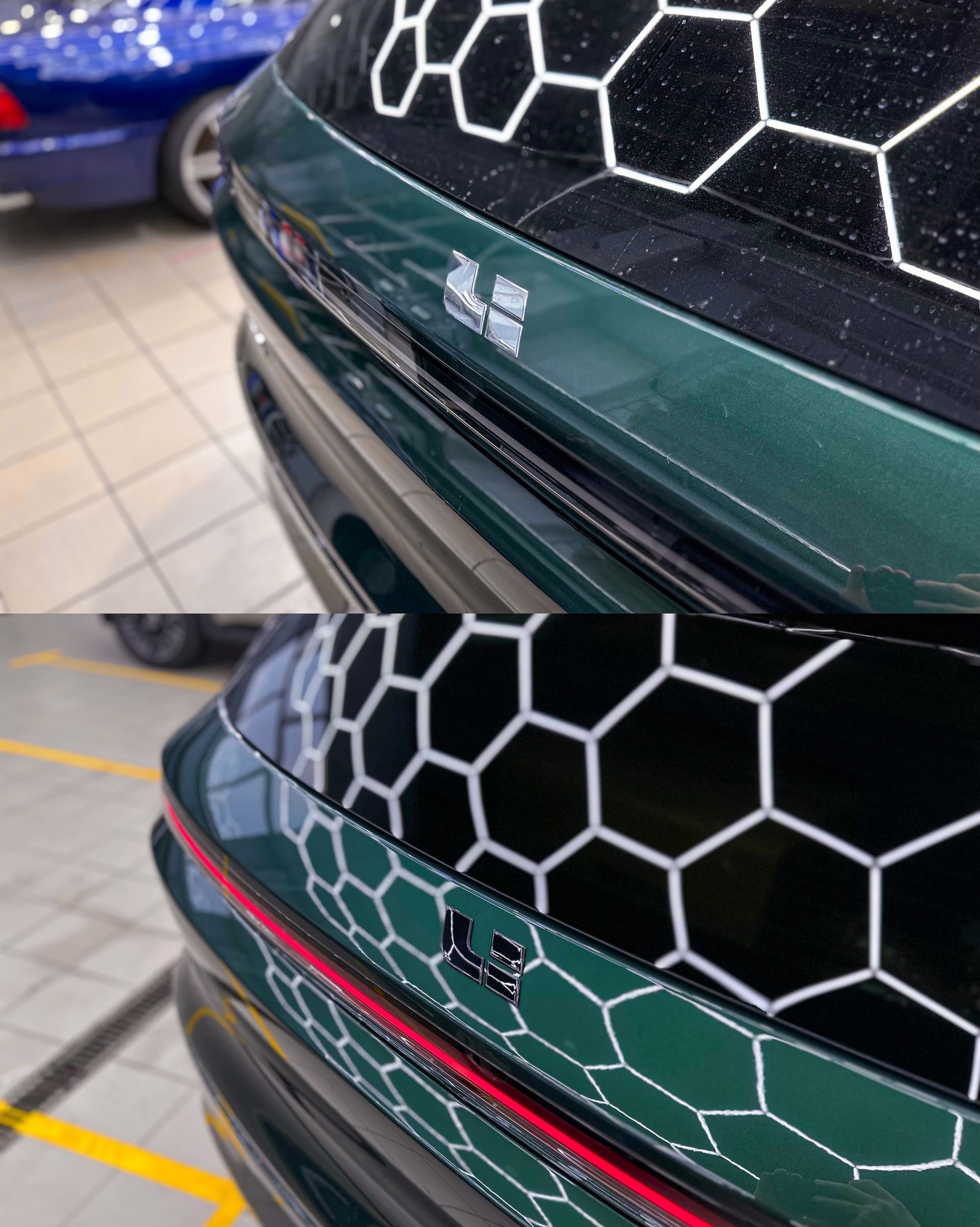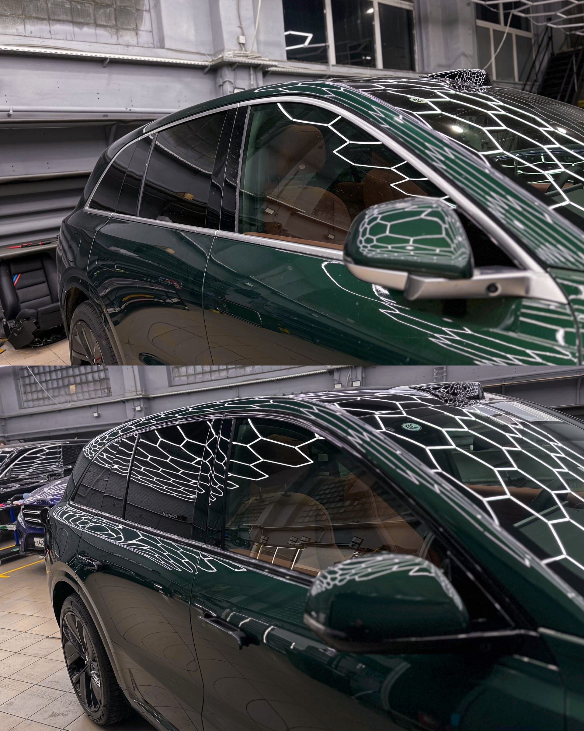 На автомобиле Lixiang L6 также была выполнена услуга по антихрому. Хромированные элементы перекрасили в черный глянец. Зеркала потребовали разборки, поскольку без этого оклейка может вызвать засветы, и пленка может начать отслаиваться от хрома, что будет выглядеть неэстетично. Шильдики Li были вытравлены и тоже покрашены в черный глянец.