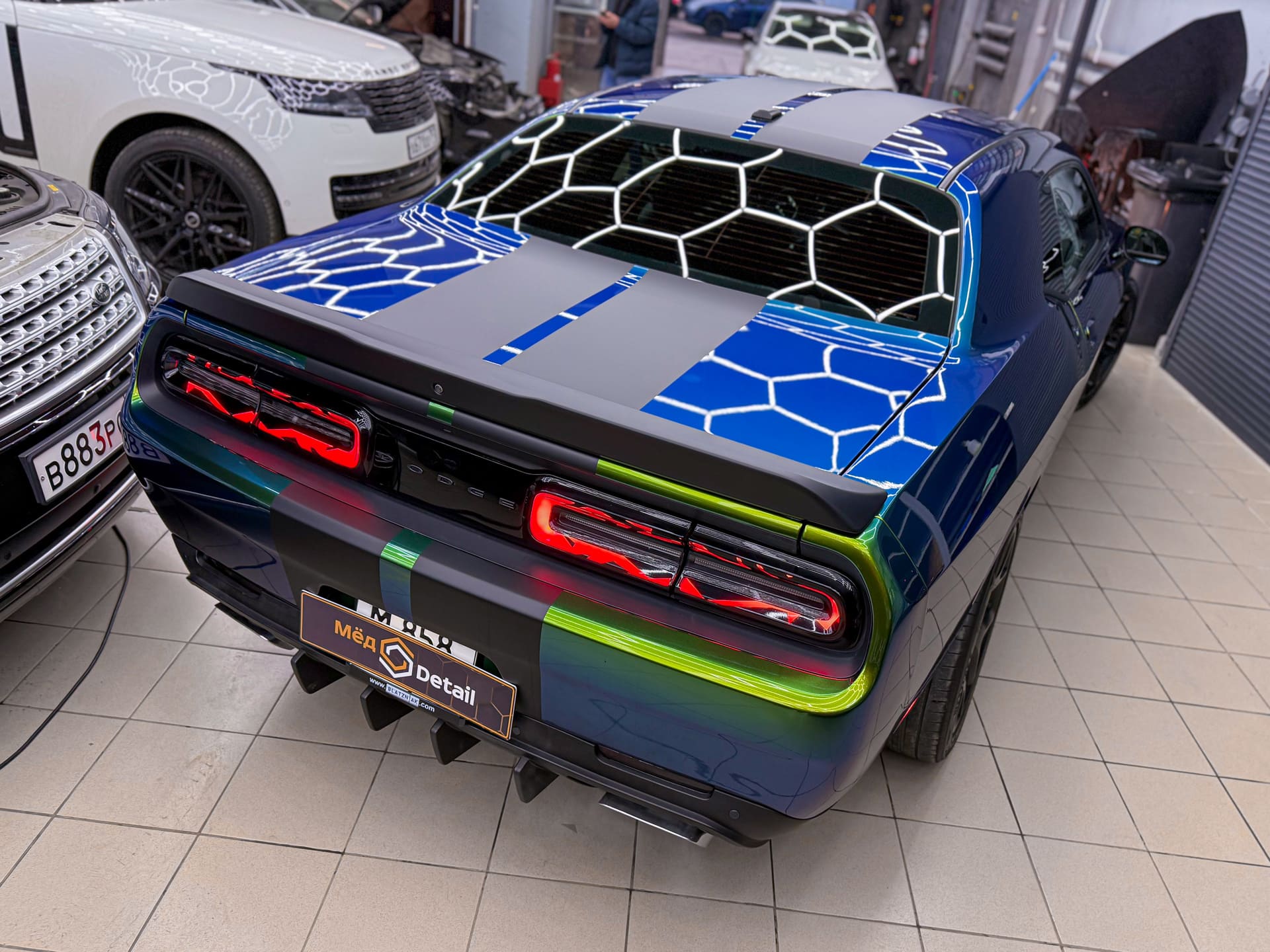В нашу студию приехал уникальный Dodge Challenger. Изначально — «скучный» белый с типично американским набором: чёрная крыша, матовый капот и немного винила сзади. Задача от клиента — радикально преобразить внешний вид и освежить салон, при этом устранить дефекты кузова. В итоге получили яркий, спортивный проект, который дарит эмоции с первого взгляда.