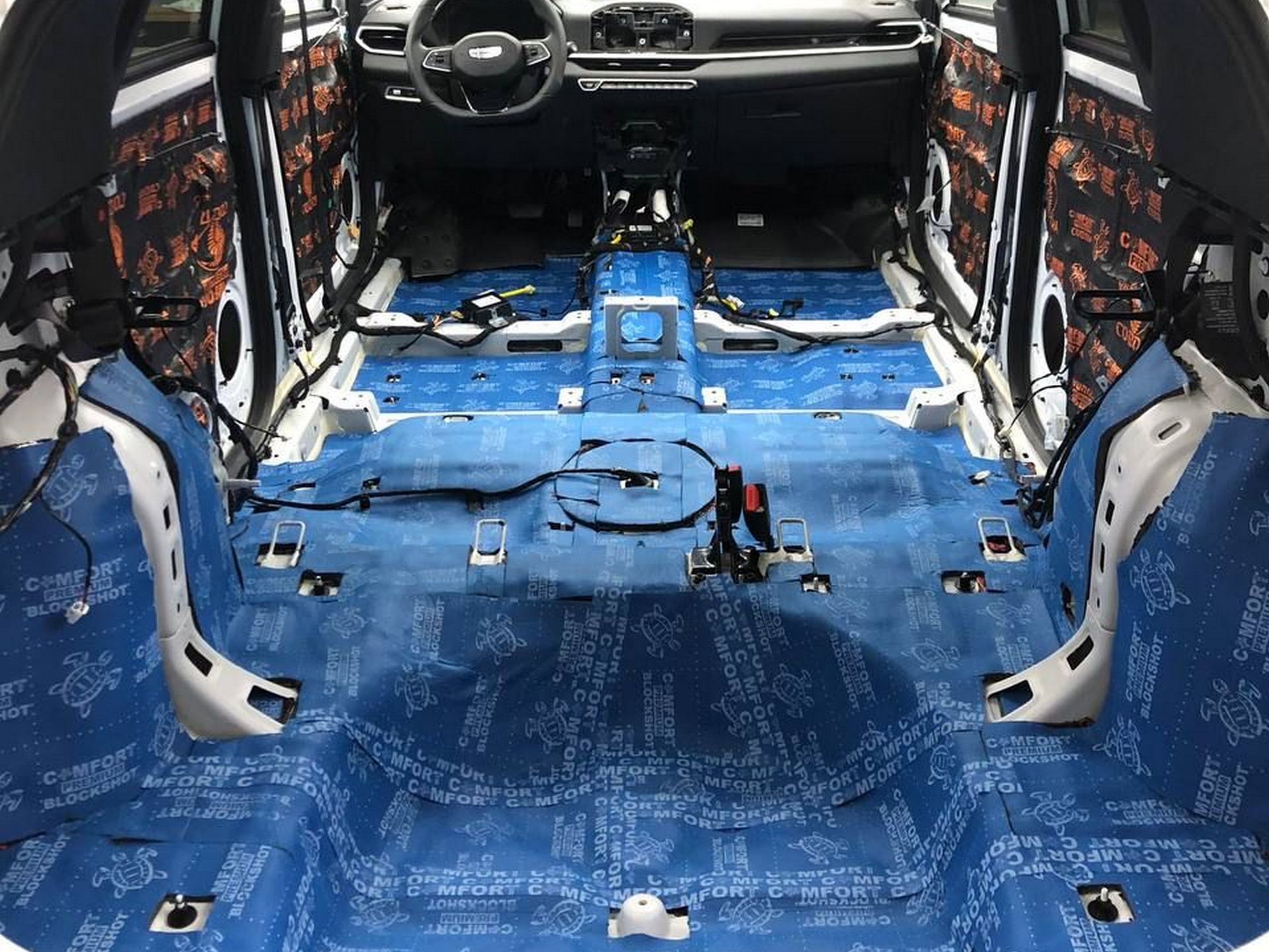 Проработали весь объём: потолок, двери, пол, нишу багажника, а также колесные арки — изнутри и снаружи. Результат — ощутимо тише на любых скоростях: меньше гула от шин и дорожного полотна, комфортнее общаться и слушать музыку.Стекольный пакет: атермальная защита и приватность